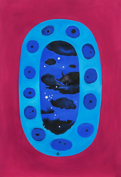 **Il y a dix ans, en 2015 Marie Hugo est invitée par Luc Jalabert à réaliser la mise en scène de la corrida Goyesque d’Arles. On y retrouve sa gamme de bleus et de roses, les taureaux bien sûr, l’encre de chine et, d’un bleu du ciel, le labyrinthe d’un minotaure astrologique tracé sur l’arène.**