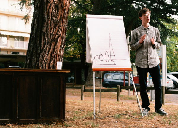 « J'appelle mes interventions conférences. C'est un mot qui peut faire un peu peur, en vérité, il faut y voir une recherche de simplicité, voire de neutralité du dispositif. Une chaise, une table, la parole. Il s'agit de raconter des histoires aussi simplement que le professeur de physique dit son cours, que l'ami relate sa journée ou que le voyageur décrit ce qu'il a vu en rentrant chez lui. Dans les conférences de poche, je m'intéresse plus aux micro évènements. Donner de l'importance aux évènements mineurs, quotidiens. Trouver le merveilleux dans ce qui nous entoure. »