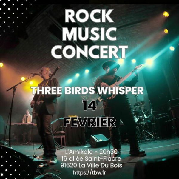 Nous avons le plaisir de vous annoncer que Three Birds Whisper posera ses amplis à L’Amik’Ale (16 allée Saint-Fiacre, 91620 La Ville-du-Bois) le samedi 14 février 2026 à 20h30.