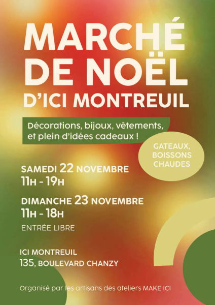 Les 22 et 23 novembre, ICI Montreuil vous invite au Noël des Créateurs ! Si vous souhaitez être les premiers à dénicher des cadeaux uniques et faits main parmi une sélection de céramiques, bijoux, luminaires, illustrations, vêtements et autres objets de décoration. Échangez et soutenez des artisans passionnés, trouvez vos cadeaux pour Noël et venez faire pause gourmande en dégustant pâtisseries et boissons chaudes ! Un rendez-vous festif et convivial à ne pas manquer !