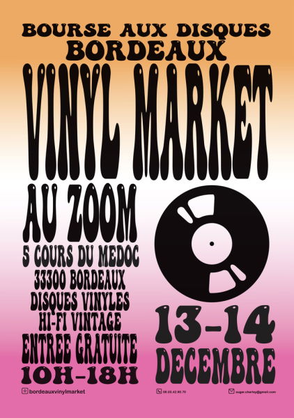 Ça se passe les **13 et 14 décembre** au **Zoom**, au chaud et au sec donc, **5 cours du Médoc**, à deux pas des quais, de 10h à 18h. L'entrée est gratuite tout le week-end et le programme est chargé : une bonne quinzaine d'exposants, des dizaines de milliers de disques vinyles, tous les grands classiques du rock, hip-hop, techno, reggae, new-wave, soul, B.O de film, jazz, hard-rock, afro, métal, brésil... l'artillerie lourde en collectors avec des disques que vous ne trouverez nulle part ailleurs, mais aussi des bonnes affaires à la pelle avec des milliers de disques à 5 et 10€ déballés pour la première fois ainsi que de la hi-fi vintage... et de quoi vous restaurer et vous poser autour d'un verre en débattant de vos trouvailles...