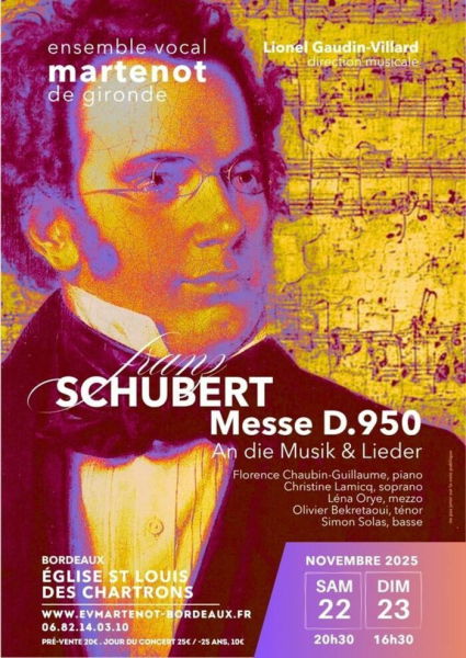 **Le samedi 22 novembre 2025 à 20h30 et le dimanche 23 novembre 2025 à 16h30, l’Ensemble Vocal Martenot (EVM) de Gironde donnera en concert la Messe en Mi bémol Majeur de Franz Schubert ainsi que An die Musik.**