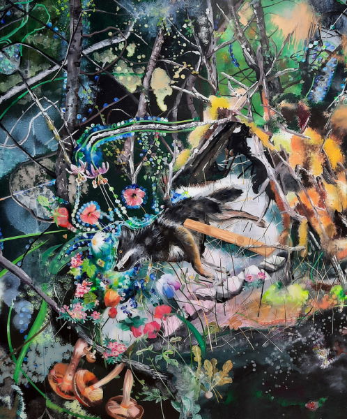 En 2019, Muriel Rodolosse investissait durablement le château du Bois fleuri avec Mirabilia. En 2025 La salle d’exposition accueille son nouveau projet construit à partir d’un grand tableau de 17 mètres de long : « J’ai rêvé d’une louve morte dans une forêt vivante et le titre m’est venu ». Ce tableau est voulu comme une aventure, une promenade dans une autre perception du vivant, transformée par les yeux de la louve, personnage central de l’oeuvre. C’est à travers son regard que Muriel Rodolosse nous invite à nous enfoncer à la frontière du visible et de l’invisible dans un paysage de forêts et de sous-bois où s’exprime dans un même élan la puissance de vie et de mort.