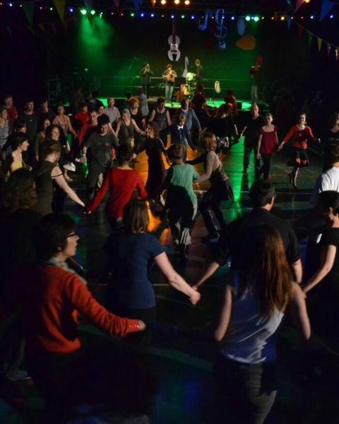 Bal concert ou concert dansant. Musique à danser et à écouter. Dans un bal trad' ou folk, les musiciens et danseurs évoluent dans une ambiance festive autour de musiques et danses d’origines ou d’inspiration traditionnelles, arrangées et revitalisées. Tout le monde peut s’essayer à la danse !