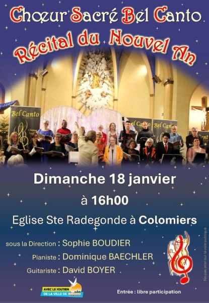 Le Chœur Sacré Bel Canto donnera son traditionnel concert du Nouvel An le dimanche 18 janvier,16h à l'église Sainte Radegonde de Colomiers. Ce Chœur bien connu pour l’énergie et la fantaisie de sa Cheffe et de sa pianiste accompagnatrice propose un programme d’extraits d’opéra, des œuvres d’opérettes, de variété et de comédie musicale. L’originalité de ce chœur réside aussi dans ses costumes et accessoires sans oublier les décors qui mettent en scène chaque œuvre chantée. Voilà un joli moment à ne pas manquer pour animer une après-midi d’hiver en famille.