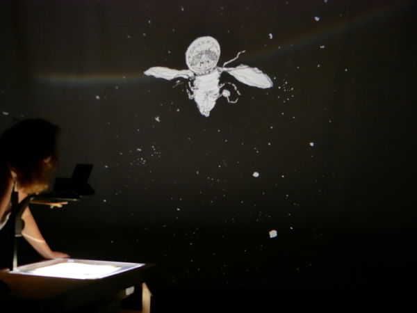 Trois interprètes se partagent le jeu en scène et la manipulation d’illustrations aux rétroprojecteurs.