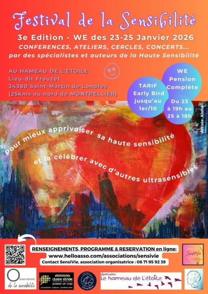 Le FESTIVAL DE LA SENSIBILITE, 3ème édition, est une invitation à un ressourcement parfait pour les personnes ultrasensibles. Il s’inscrit dans les événements francophones autour du 13 janvier, journée mondiale de la sensibilité.