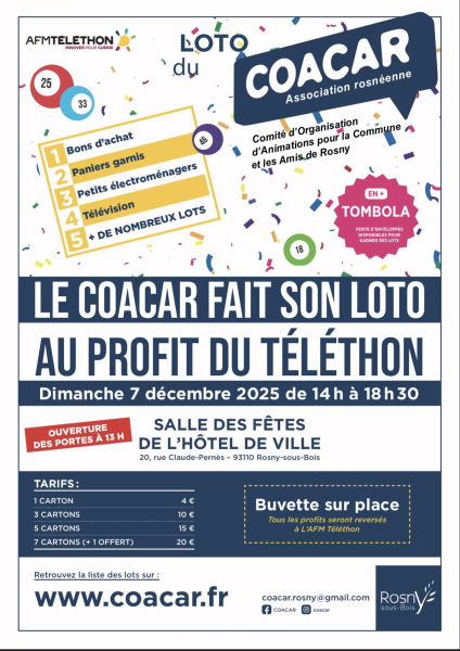 Le COACAR a le plaisir de vous inviter à son traditionnel Loto au profit du Téléthon, le dimanche 7 décembre 2025.