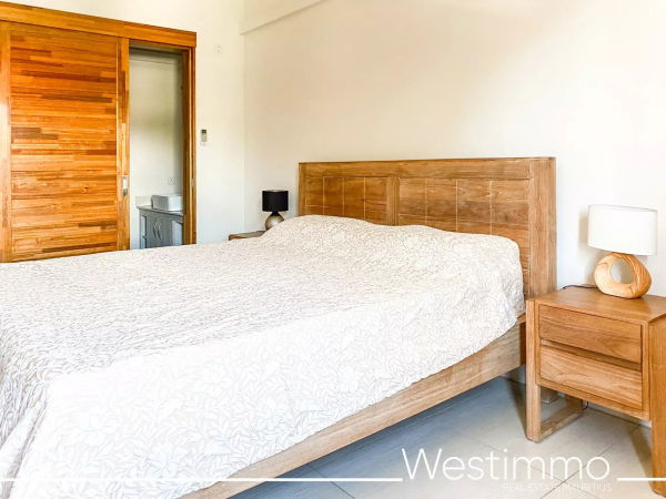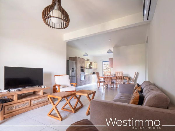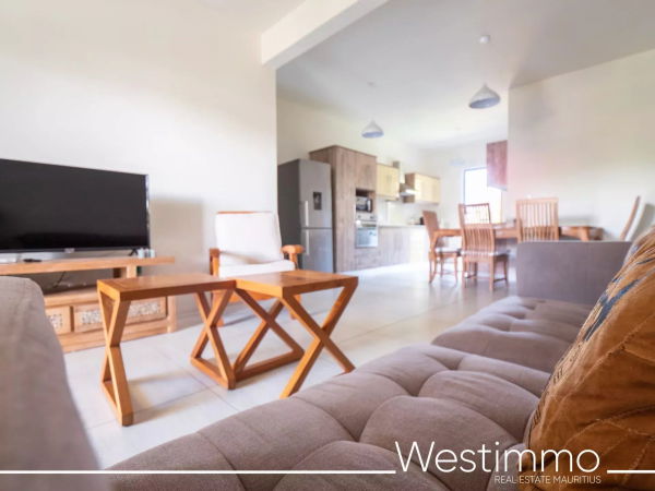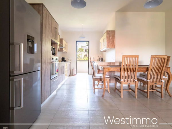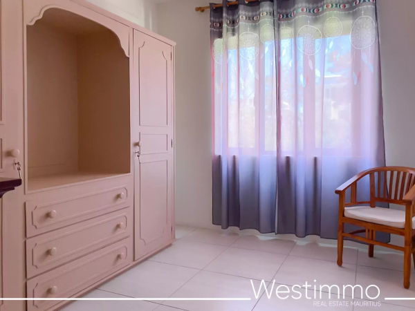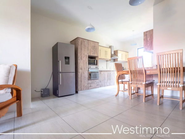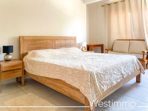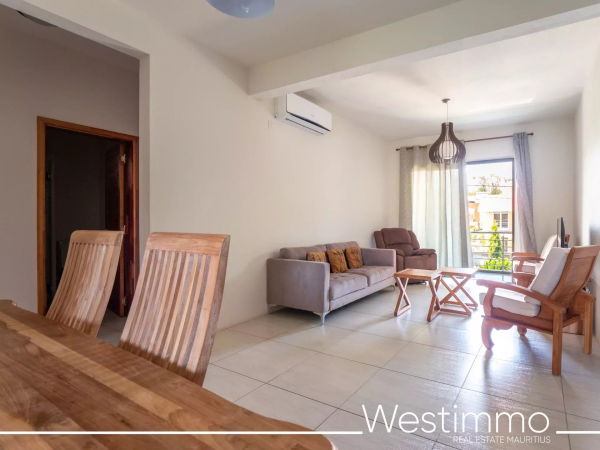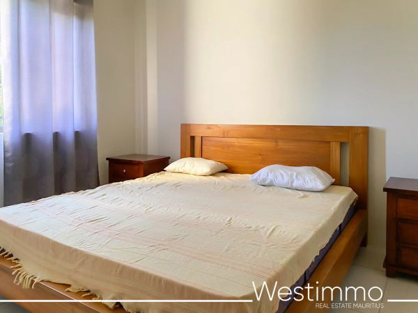 Joli appartement de 2 chambres avec son design moderne est en location long terme à Flic en Flac dans une résidence sécurisée avec piscine commune et proche de la plage.