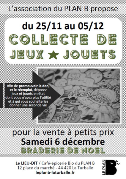 Afin de promouvoir le don et le réemploi, l'Association du Plan B organise une vente de jeux & jouets de seconde main à petits prix.