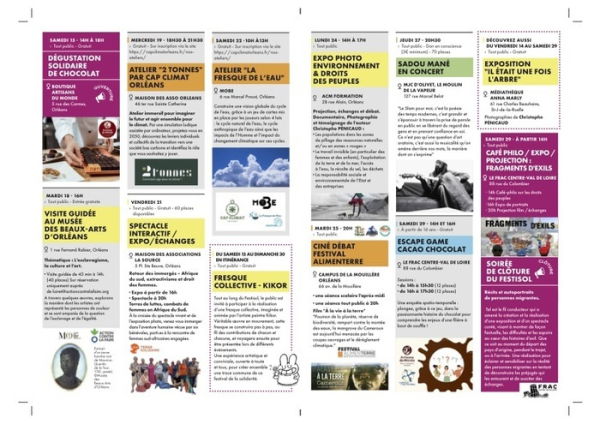 Le programme du Festisol Orléans 2025 est des plus variés : spectacle interactif sur les combats de femmes en Afrique du Sud à la Maison des associations, atelier La fresque de l'eau au Musée des Beaux-Arts, exposition photos sur le pillage des ressources naturelles chez ACM Formation, concert de Sadou Manet à Olivet... La journée de clôture se déroulera au Frac (entrée boulevard Rocheplatte) avec, dès 14h, l'organisation d'un escape game sur le thème du cacao (2 sessions : 14h/15h30 et 16h/17h30), la présentation par d'une exposition d'autoportaits et la projection du court-métrage "Fragments d'exil".