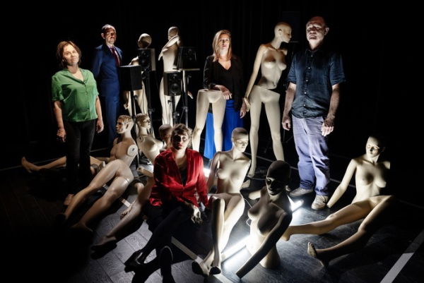 Sur scène, salariés et dirigeants dialoguent avec un chœur de haut‑parleurs installés dans des mannequins de prêt-à-porter et rejouent les échos d’une chute annoncée, mêlant leurs voix à l’électronique et au trombone, nouvel aulos qui renvoie aux premiers temps de la tragédie antique.