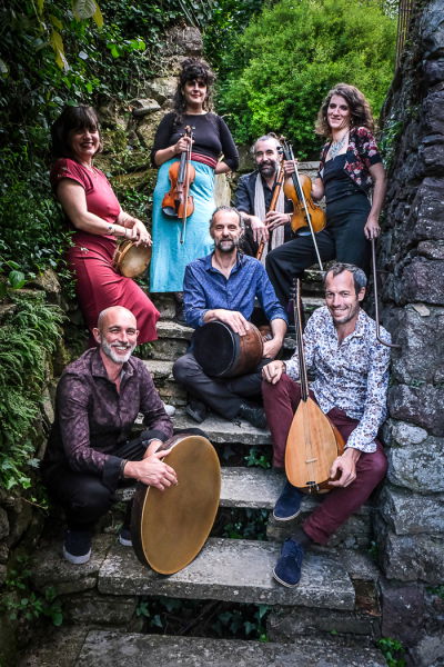 Sept musicien·ne·s passionné·e·s qui explorent les traditions musicales de la Méditerranée orientale. Puisant dans les répertoires populaires grecs et kurdes, le groupe façonne un univers vibrant où se mêlent polyphonies féminines, percussions persanes et orientales et instruments emblématiques tels que le saz, le laouto, le daf ou la darbouka, de la mer Ionienne à la mer Égée.