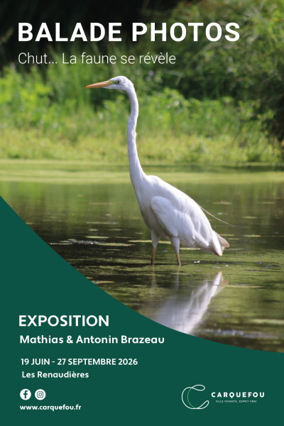 La Ville de Carquefou convie Antonin et Mathias Brazeau, deux jeunes frères carquefoliens, passionnés de nature et de grands espaces, à exposer leurs photographies en plein air, du 19 juin au 27 septembre aux Renaudières. Une trentaine de clichés y célèbrent la faune locale, capturée au fil des saisons.