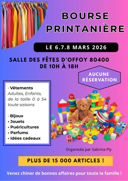 BOURSE VETEMENTS ENFANTS ADULTES JOUETS PUERICULTURES OFFOY 80400 LES 6.7.8 MARS DE 10H A 18H SALLE DES FËTES