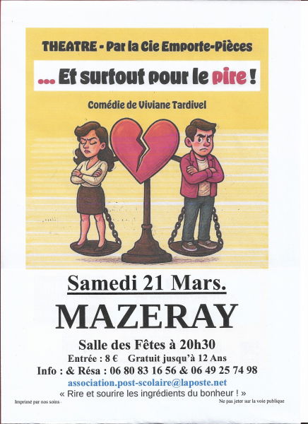 MAZERAY 17400 Théâtre Le 21/03/26 à 20h30 Salle municipale