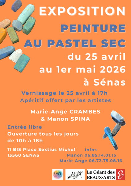 Marie-Ange Crambes et Manon Spina vous accueilleront pour une exposition en duo dédiée au pastel sec, où se rencontrent paysages, portraits, animalier, floral, natures mortes et compositions plus abstraites - pour tous les goûts.