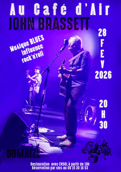 Prochaine soirée au Caféd'Air ce sera SAMEDI 28 FEVRIER en compagnie du Blues'man John Brassett 🥳 Sur place : restauration "ensol" a partir de 19h. Sur réservation par SMS au 06 15 30 16 53