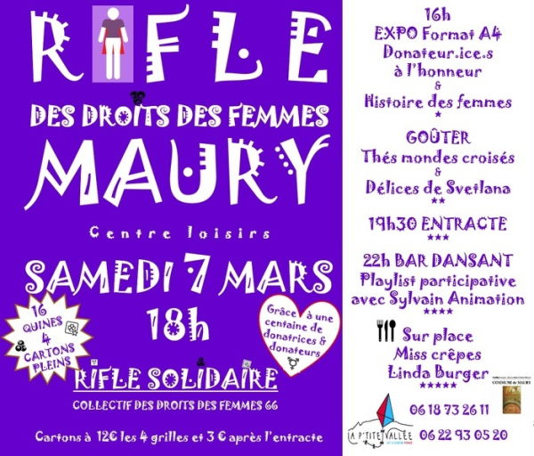 ### A l'heure du thé, la bibliothèque municipale y ouvrira l'exposition "Format A4" valorisant la participation des donatrices et donateurs des lots-récompenses des quines et cartons pleins. Thés Mondes Croisés et les délices sucrés de Svetlana saupoudreront ce temps d'échanges et de rencontres. C'est ainsi que la rifle des droits des femmes, solidaire du Collectif des droits des femmes 66 organisée par l'association La P'tite Vallée accueillera le public.