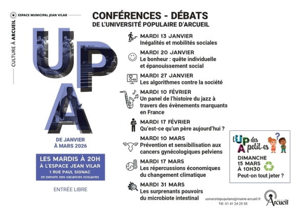 L’Université populaire d’Arcueil organise des conférences débats portant sur des sujets de société. Entrée libre, sans réservation dans la limite des places disponibles.