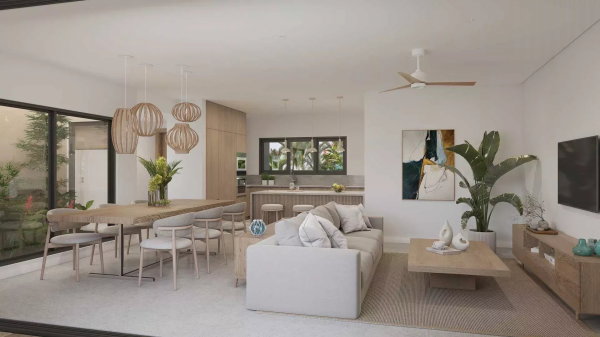 - Design élégant et harmonieux : Une parfaite symbiose entre l’intérieur et l’extérieur, avec de grandes baies vitrées permettant à la lumière naturelle d’inonder les espaces de vie