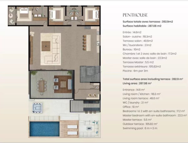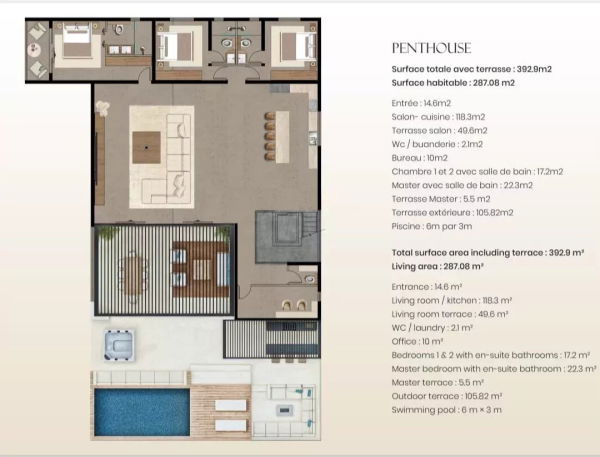 - Superficie totale : 393 m², avec 287 m² de surface habitable et un toit terrasse privé de 106 m².