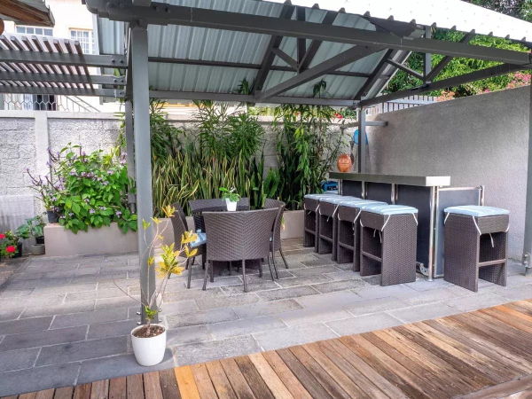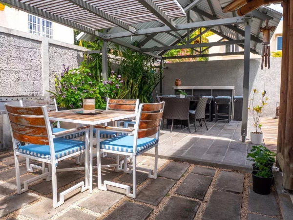 Une varangue équipée d'un bar et d'un barbecue.
