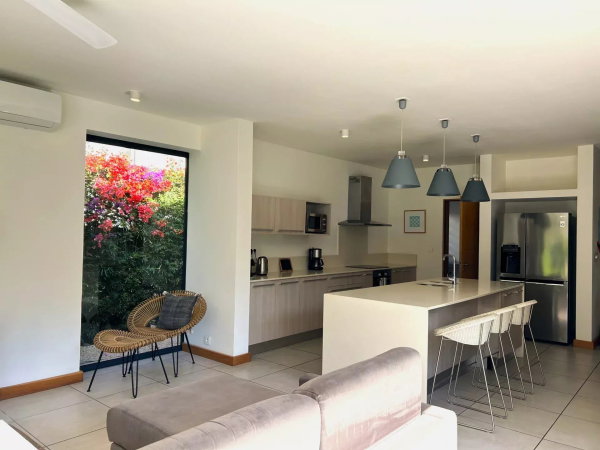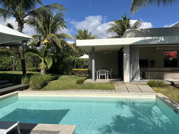 L’organisation des espaces est fluide, agréable. Dès l’entrée, on découvre un séjour lumineux, largement ouvert sur un jardin tropical. L’ambiance est paisible, la décoration soignée sans être figée. À l’extérieur, une piscine privée apporte fraîcheur et intimité. C’est ici que la suite parentale a trouvé sa place : au calme, avec une salle de bain élégante et une douche extérieure qui invite à profiter du climat.