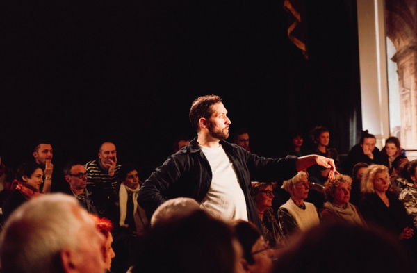 Hugues Duchêne, metteur en scène et auteur, est le fondateur du Royal Velours et diplômé de l’École du Nord. Passionné par la politique française, il crée des fresques documentaires exigeantes mêlant théâtre et réalité contemporaine. Son travail interroge avec humour et rigueur les récits officiels, la parole publique et les mythes fondateurs.